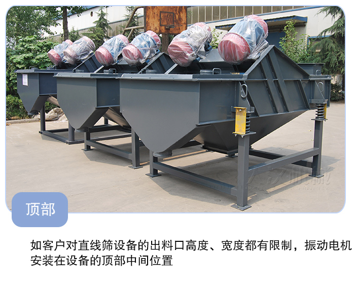 這種安裝方式在HYSF系列直線振動篩中是不常見,很少有人這么做,不過HYS直線篩通常采用這種安裝方式,如客戶對直線篩設備的出料口高度、寬度都有限制,那么振動電機不論是安裝在底部仍是兩側都不能達到要求,這時就可以將振動電機安裝在設備的頂部中間位置,這樣既不增加設備的寬度,又不影響降低設備出料口的高度。
